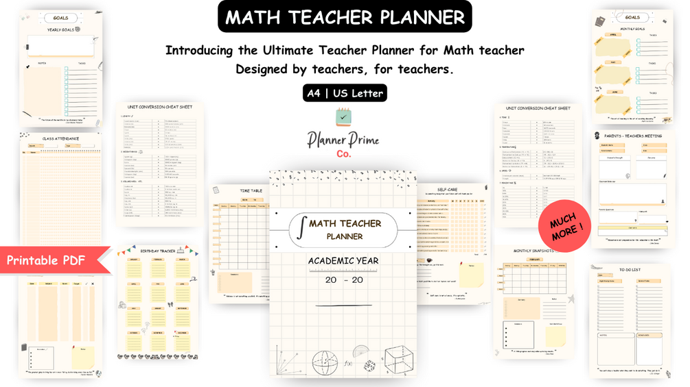 Transform your teaching with this undated math teacher planner—a 38-page printable PDF designed by teachers, for teachers. Perfect for math teachers in elementary, middle, or high school, this reusable planner includes graph paper, unit conversions, customizable timetables and much more to simplify lesson planning, student management, and self-care.