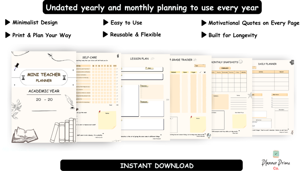 Simplify your teaching with this undated mini teacher planner—a 6-page printable PDF designed by teachers, for teachers. Perfect for educators who want a compact, affordable planner, this reusable mini version includes daily planning, monthly snapshots, lesson planner, grade tracker, self-care, and motivational quotes to keep you organized on the go.